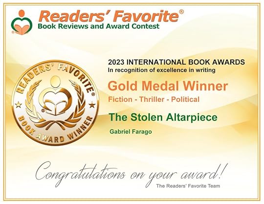 I have something exciting to share with you, my friends. The Stolen Altarpiece has just won a gold medal in the prestigious Readers’ Favorite Literary Awards in the US.