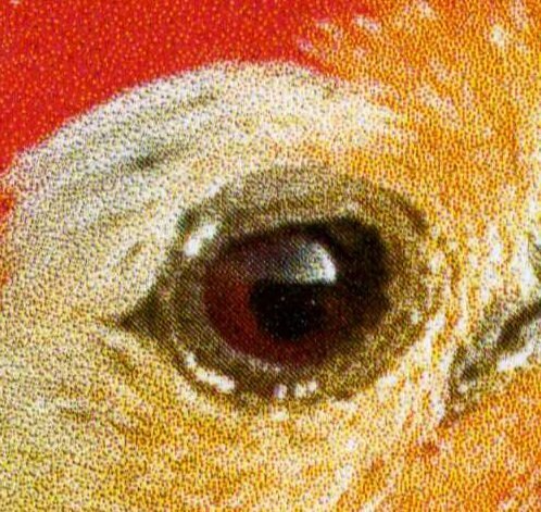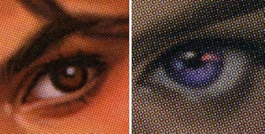 Neither of these book covers is truly state-of-the-art, however. A more modern printing process uses dithered placement of individual colored dots instead of a regular rosette pattern. Here’s an example, a 1200 DPI scan of a hummingbird’s eye from the cover of a recent Physics Today: