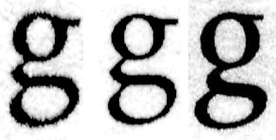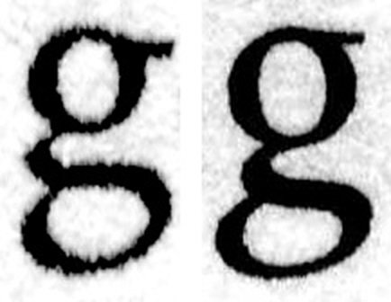 Let’s compare two of the same letter, a lower-case “g”. The Gap Year is on the left, set in Adobe Garamond. Cytonic is on the right, set in Monotype Apollo. Since the fonts are different, the exact shapes of the letters will be different, so just look at the black edges: