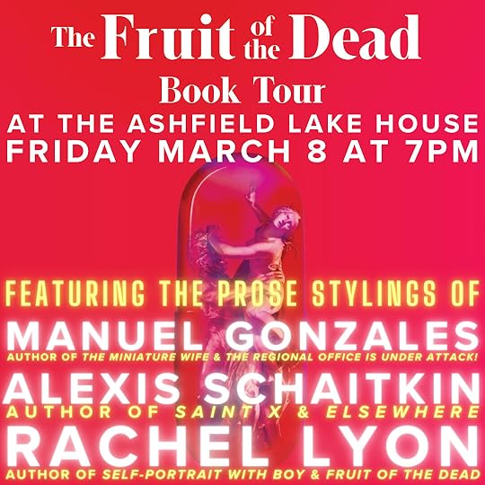 I’ll be back home long enough to do a reading / party at The Ashfield Lake House at 7PM on Friday, 3/8, where I’m sure to be totally outclassed by the charming and accomplished Alexis Schaitkin (Saint X, Elsewhere) and Manuel Gonzales (The Miniature Wife and Other Stories, The Regional Office Is Under Attack!, and the forthcoming Blackthorne Island)—