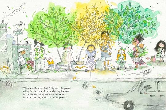 Lily wants George to see the world, so she places him in a wagon and pulls him around their gray, treeless neighbourhood. Soon Lily realizes that George can offer shade and cool air to the people she meets in the sweltering city: to old Mrs. Lee sitting breathless on a sidewalk bench, to people waiting at a bus stop under a burning sun and to two friends with their melting popsicles, who soon join her with their own "walking trees."