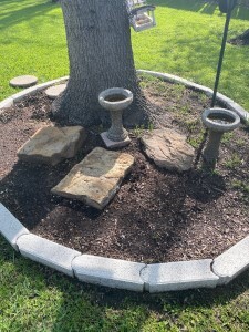 I'll buy some fresh mulch in a week or two, I'm thinking red this year for a pop of color, and fill in all the spaces around the rocks and fill up the bordered space to help my tree retain any moisture come the heat of summer.