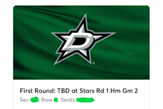 The Stars were the first team to clinch a playoff berth, as they say, and now, DD and I are the proud owners of tickets to the second home game of round one, dates yet to be determined.