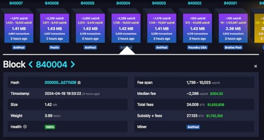 More FeesIt wasn’t just block 840,000 that had high fees, over the next 5 blocks, we had fees of 4.486, 6.99, 16.068, 24.008 and 29.821 BTC respectively. The fees are the highest it’s ever been. This situation in Bitcoin is unprecedented.