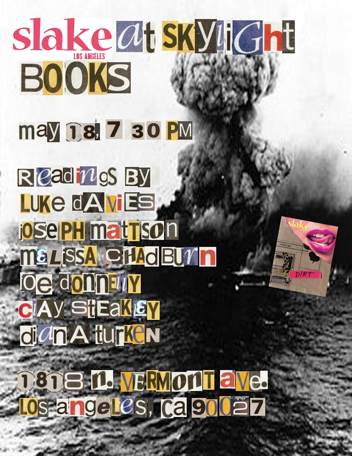 Great lineup: Luke Davies, Joseph Mattson, Melissa Chadburn, Clay Steakley, Diana Turken, Joe Donnelly... reading from Slake #4, "Dirt." It's beautiful stuff and you should come. Thanks.