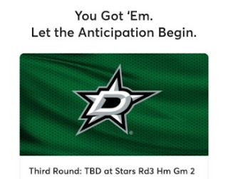 Speaking of the Stanley Cup Playoffs, Round Two has come and gone since last we chatted. And the Stars are still playing hockey. WHOOO! They're currently in the middle of the Western Conference Final.