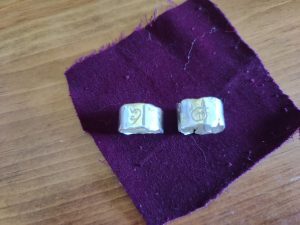 Below, our rings. The ring on the left is mine; inscribed with Mette, the rune for courage. Made by Phil Jurus, oh-so-very-long-ago. The ring on the right is Steve’s, and I sadly no longer remember the name of the rune for persistence. Also made by Phil Jurus.