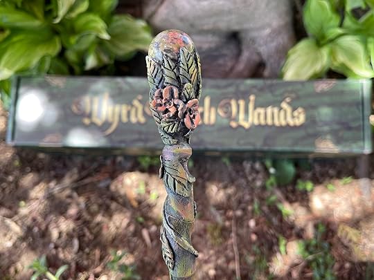 A fairy or hedgewitch wand with green leaves and pink flowers, painted to match the earthy tones of the ukanite sphere at its base.