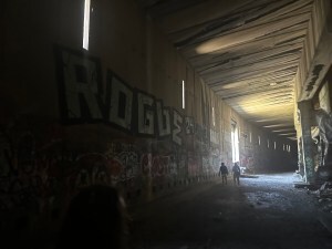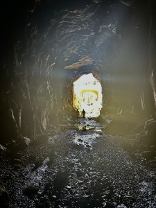 —The third tunnel goes on forever. This one feels modern, with straight edges and beams framing the rockpiles on the inner wall. We wonder about the history of drilling and improvement. There is no one to ask, no signboards offering explanations. It feels like an abandoned subway in a post-apocalyptic film. The only variation on the endless walk is the graffiti, but even that starts to feel repetitive. We smell urine.