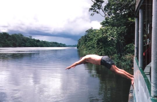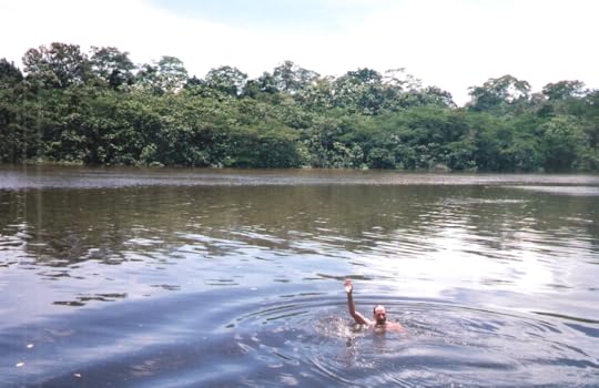 We come back to the boat and have breakfast, then siesta. In the afternoon Bob and I go swimming in the black waters of this Amazon tributary where gray and pink dolphins roam. (Few piranhas in this part of the river, this time of year we are told, and dive in trustingly) The water is cool and clean, very refreshing. The current is amazingly strong.