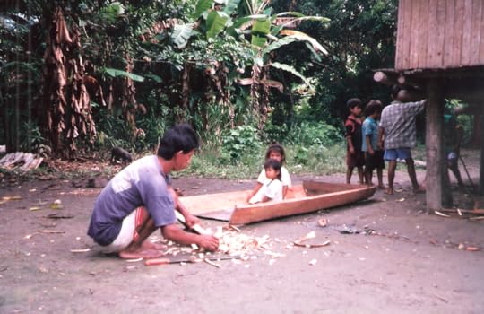 We land and walk through a village. Children, rather serious, return my smile, a bit reluctantly. No begging in this village and no bartering — except for one woman who furtively offers to sell me a blow gun. She pantomimes the action of blowing through the gun. (I regretted not buying it — but I would soon have another chance…)