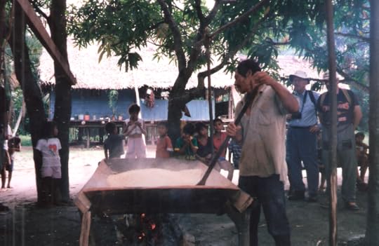We watch another man roasting farina over a low, smokeless fire. He stirs it continually with a paddle.