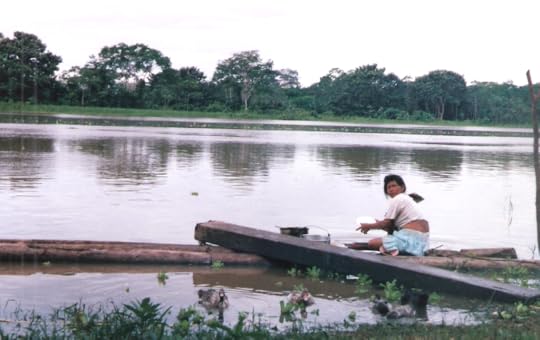 Nearby, a woman washes dishes in the river; another washes clothes.