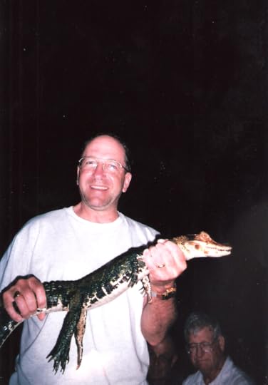 Then Roger spies a caiman! Victor and Secundo try to catch it but it is very big and they let it slip away. Roger spies another one and this one the guys catch — a small Black, perhaps 3 feet long. The Black caiman is more rare and more fierce, we’re told, than other species. We pass it around and I take a picture of Bob holding it, I can see it breathing, or swallowing, its throat goes in and out. After we nearly blind it with flash bulbs popping, we release it and go on — and catch another one — a different species, a Spectacled caiman, smaller and more common.