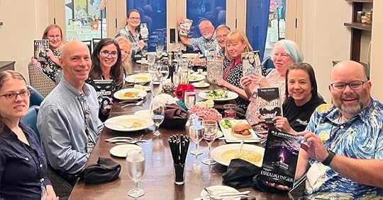 About the pictures:The top image is my talk for upcoming WriterCon 2024. The bottom image is wonderful dinner we had with a whole bunch of other Babylon Books authors at WriterCon 2022. Our tribe.