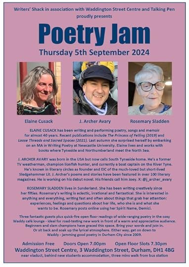 My next gig is on Thursday 5th September at Poetry Jam in Durham’s Waddington Street Centre. Doors 7pm, event starts 7.30pm. Open mic slots available and admission is FREE.