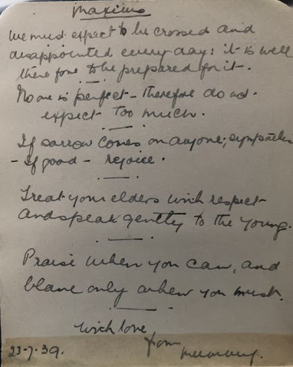 My sister just sent me this in a tweet - it was written by our maternal grandmother in 1939, in our mother's autograph book. Mum was 13 at the time. We never met our grandmother because she died of cancer two years later.