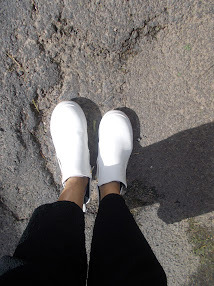 My trendy white shoe/boots, which Judith thought were galoshes.