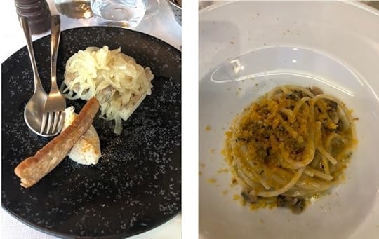The Venetian lagoon and the famous Rialto fish market ensure super fresh seafood is a staple of the local cuisine, but two specialities famously feature preserved fish, a hangover from ancient times when sailors on long expeditions relied on the ability to treat fish with salt or vinegar to keep it wholesome. Baccalà mantecato, widely available where cicchetti are served, is salted poached cod, whipped with olive oil to a creamy spread and piled onto grilled bread or toasted polenta. Utterly delicious. Another Venetian signature dish is Sarde in Saor a sweet/sourcombination of sardine fillets, onions, pine nuts, raisins, and vinegar. We tried both of these at the high end Pensione Wildner, close to the San Zaccaria vaporetto stop, where they serve their sardines with sauerkraut and the prices reflect the heritage and location. It was well worth it for this and the traditional Spaghetti alle Vongole e Bottarga (spaghetti with clams and seasoned with mullet roe).