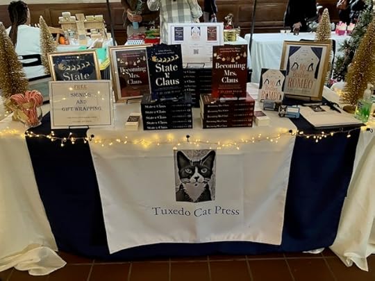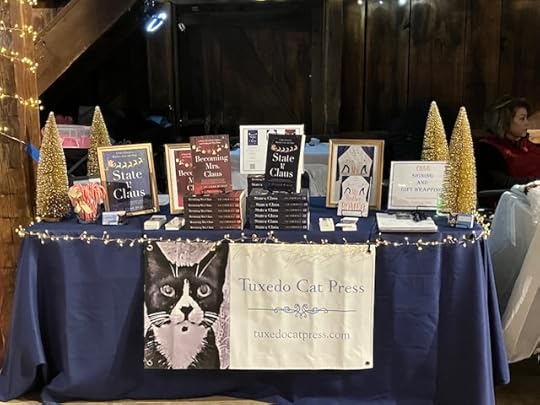 Ask lots and lots of questions. Some organizers send out flyers, maps, and informational emails so that you’ll know everything from set-up times to what equipment to bring. If the organizer doesn’t tell you, be sure to ask. Will chairs and tables be provided? How big is your space? Will you have access to electricity if needed? Do you need to bring a tent? If you don’t ask, you may be unpleasantly surprised when it turns out that you have nowhere to sit.Bring a wagon, hand truck, or other way to transport bins. Books are heavy. Decorations for your space may be bulky or awkward to carry. Parking may be a lengthy walk from the entrance. Especially if you plan to take part in several events, a hand truck, a dolly, or a collapsible wagon is a good investment.Set prices at round numbers. Trust me when I say that you don’t want to spend the day worrying whether you have enough pennies. While traditional wisdom dictates that prices should end in .99, show pricing is different. Say you normally sell your book for $18.99, and state sales tax (which you do have to collect) would make the total $20.20. Make life easier for your customers as well as yourself: charge $20.00 even, and take the twenty cents out of your share. It’s much easier for a customer to hand over a twenty-dollar bill and leave with your book than to fish around in pockets and change purses for dimes which, let’s face it, most people don’t even carry anymore, which means you’d have to make change. Who needs the aggravation? Trust me, if you set your price at a round number, the sales will be much simpler, and you won’t miss the coins.Consider offering special deals or extras that people can only get at a show. Last year, my printer sent me over three dozen books with black marks along the top. The text was fine, but there was no way I could sell these books, especially when people often buy my books as gifts. Obviously, I complained and the printer replaced them, but they didn’t want the defective books back, so they’ve been sitting around my office for the past year—that is, until I went to the South Windsor Apple Fest. I took a dozen of the defective books along with my regular inventory of pristine copies, and I sold the defects at half-price, and guess what? Every one of the defective books sold, because people love getting a deal. It’s the same reason I offer a small discount if someone buys both State v. Claus and Becoming Mrs. Claus . Those who come to artisan fairs and holiday markets are obviously happy to spend a bit more to support local craft folks and authors, so it’s nice to give them a little deal as a way of saying “thanks.”Be creative with your setup. I have two folding tables, one four feet long and the other six feet. When I take part in an event where I have to bring my own table, I always take both. Last spring, when I was at a multi-author event on the town’s Main Street, I was lucky enough to be on the corner by a four-way intersection with traffic lights. I set up my tables parallel to each other so that I could have one facing the intersection and the other facing the sidewalk to draw attention from those walking as well as driving. Other times, I’ve made them into a V or L, depending on space. At the holidays, my main décor (other than the books and framed covers) consists of gold bottle-brush trees and strings of battery-powered lights, but in the warmer months, I put large bunches of artificial daisies in wire lantern holders weighted with gauze bags of marbles (I discovered the hard way that they’ll blow over if they’re not weighted).Offer freebies. I have stacks of bookmarks for both State v. Claus and Becoming Mrs. Claus . On one side is the book’s cover and some gold decorations; on the other side is the Tuxedo Cat Press logo, together with the website address and a QR code. People love to take bookmarks even if they’re not buying a book, and I’m happy to give them out because who knows when they’ll pick it up and think, “I remember meeting this author. I wonder what her book is about?” Also, I offer candy because that’s what Santa would do. (Note: if you’re going the candy route, make sure it won’t melt. Once, I took Hershey’s chocolate kisses to an event where it turned out we were in the August sun with no tent, and you can guess how that turned out.) At the holidays, I offer candy canes, and in the spring and summer, I have peppermints—all individually wrapped, of course.Don’t forget to advertise. Few things are as disappointing as telling someone about your event after the fact and having them say, “I wish I’d known! I’d have come!” If the event’s organizer doesn’t have a flyer for you to use in your ads, use your book covers as the artwork when you post about the event. (I periodically work with one fantastic event host who checks to see whether her vendors are doing their part in advertising the event.) Be sure that your posts include the event date (including day of the week), opening and closing times, and the location—not just by name (the Town Green), but also the physical address so people can put it in their GPS. If the venue offers free parking, include that in your ad. The more you advertise, the better the chance that someone will come to see you because they saw your name on the post. Remember: nobody can come to an event they don’t know about.Have fun! Whether the day is quiet or busy, be sure to take some time to enjoy yourself. If nothing else, it’s a chance to watch people and gather material for characters in your next book!