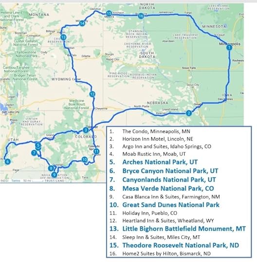 In Part 1 of this travel blog, I began the description of our recent 4,128-mile road trip, during which we visited six National Parks and one National Battlefield. As a reminder, here’s a map of the journey: