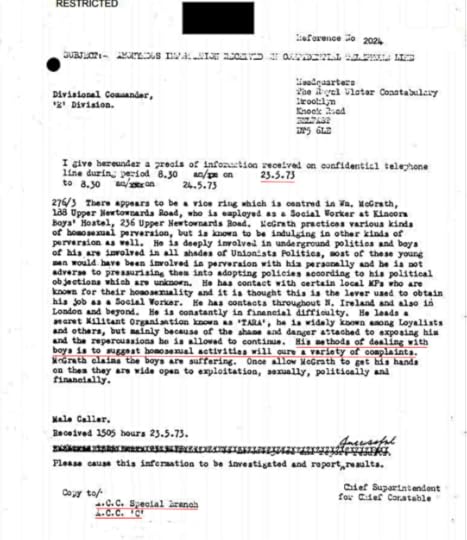 Garland made numerous efforts to halt McGrath’s abuse of boys. On 23 May 1973, he rang the RUC on a confidential line. His complaint was recorded in a log in 1973. It is reproduced below.