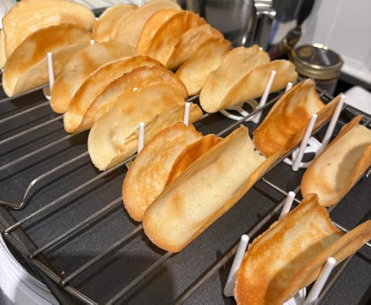 To recreate the Choco Taco at home without a waffle cone maker, I turned to a recipe for making homemade ice cream cones in a pan (Tiffin Box on YouTube: https://www.youtube.com/watch?v=ylgNV...) which is very similar to the recipe I had previously used for fortune cookies, using powdered sugar and egg whites: