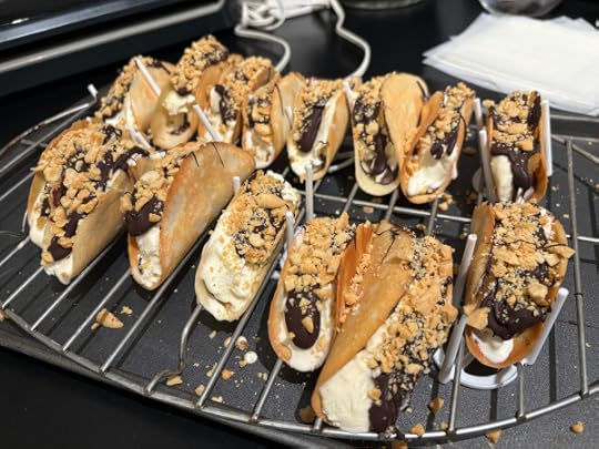 In the bottom of each shell I spread a bit of organic hazelnut cocoa spread (like Nutella, but one of the hoity toity organic brands), then carefully packed in vanilla ice cream. Then I tempered a bittersweet chocolate sauce to top it with, sprinkled with crushed roasted peanuts before the chocolate could harden. To serve it, I drizzled each taco with a salted caramel sauce, and served it with some extra caramel and fudge sauce on the plate.