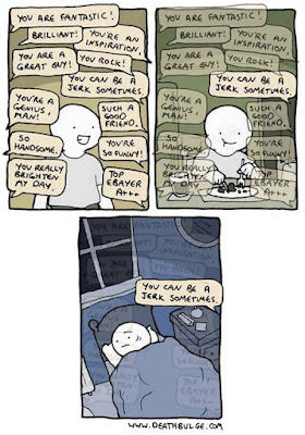 Why do we do this? Why does our very "evolved" human brain (for some of us, cause, some of us don't ever hear those voices because they always think they're great... apparently) just latch on to that one mosquito in the room buzzing around saying the mean things?
