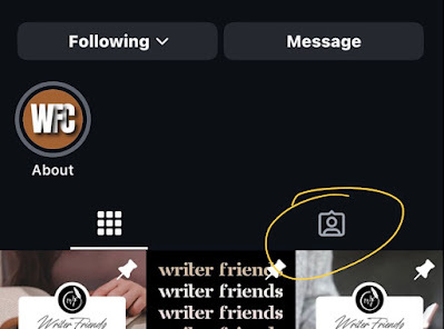 3. When you look for people posting, don't just go to the #WriterFriendsChallenge. Also go to the account @writer.friends.challenge and click on the tag symbol with the outline of a person. (Tip: It's directly above the posts, to the right. You'll see one other option that's 9 stacked squares. Tags is to the right of those 9 stacked squares.) When you go there, you'll find the other people who tagged the account in their post. This is the best way to find the most current posts since the hashtags do not give you the option to see recent posts as they used to, so you'll see posts for months and years past all mixed up. Not ideal when you want to see new posts.
