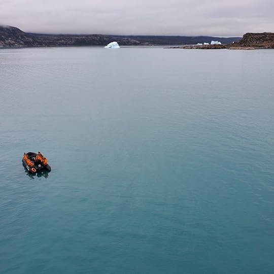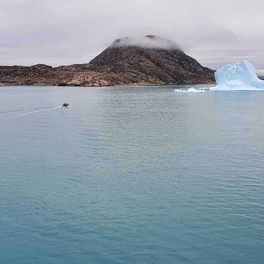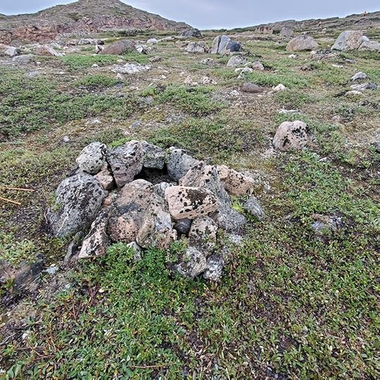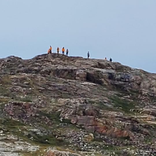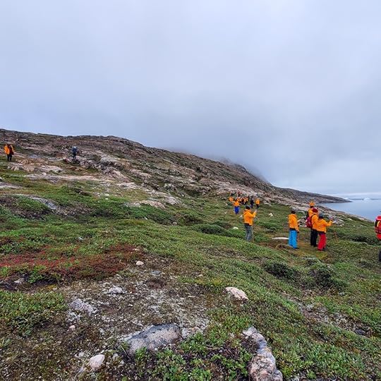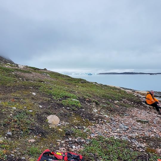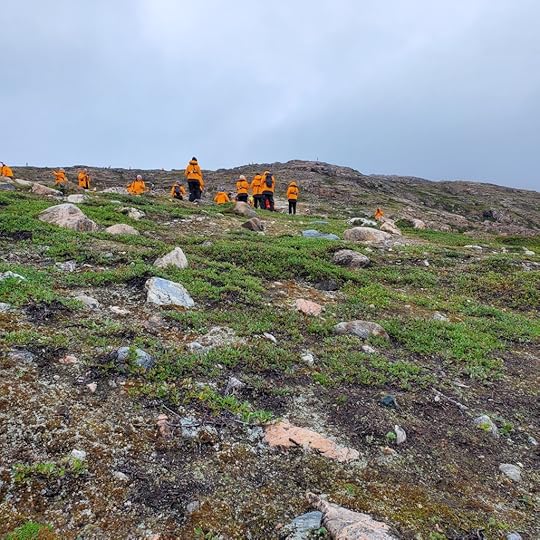 With my fiberglass stakes, I tromped up the slippery slope where our Greenland native expert provided information on the kind of people who lived here ages ago. I noticed several holes around, including the one above, which she said were used for shelter or storing food. These nomadic people came to this same place every year to fish. We were told we could wander around the area but not to pass the perimeter (those fiberglass stakes) set up by the crew, who we could see in the distance at the top of the hill, armed with rifles. Quite a few adventurous souls climbed to the top of the ridge. I didn’t try it. Being clumsy anyway, I didn’t want to risk a broken ankle or leg our first day out. Hearing the stories of these indigenous people and how they survived in such harsh conditions was fascinating. I felt grateful to see this incredible place and to know the land I walked on hadn’t changed much in thousands of years.