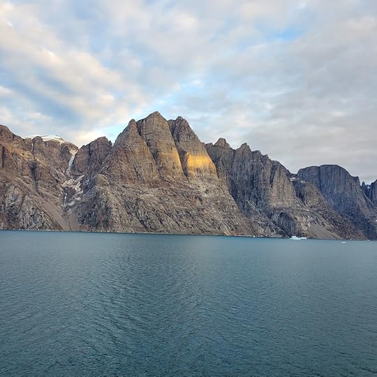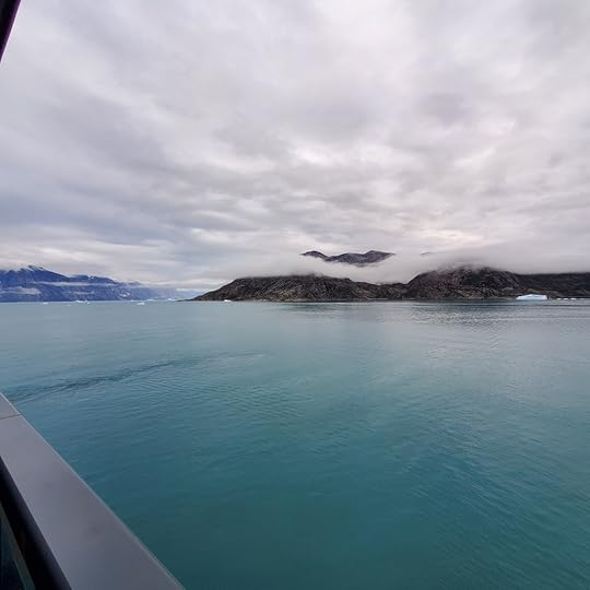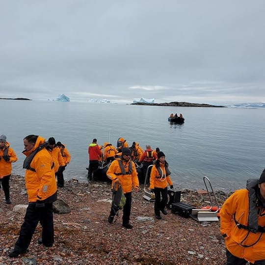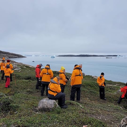 From ‘down unda” to the top of the world, we arrived in the waters off Eastern Greenland in early August 2024. We flew into Reykjavik and boarded our small expedition ship. First on the list was to get fitted out with our parkas and boots. We went to the ship theater in groups to find our parka and try it on to make sure of a good fit. The parka was in two pieces. First, we put on a “puffy” zip-up coat (plenty warm by itself), and then came the bright ‘goldenrod’ waterproof outer parka with lots of velcro fasteners and a hood. Mine was a little snug, so I pulled it all off and tried again. The life jackets that looked more like belts (tucked in the drying closet in our cabins) went on last. I wondered if this experience was similar to what Victorian women went through when they dressed in their multiple layers of under and outer clothing. Umm. I’m sure the bright color was necessary to ensure one didn’t wander off.