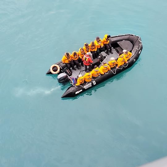 After the parka fitting, we trooped down to the “mud room” near the zodiac launching area, to be fitted with our boots. These would be necessary during water landings. That’s about the only way to get to shore in this part of Greenland. Being the savvy traveler I’m supposed to be, I totally dropped the ball preparing for this journey. My only excuse is we had just come from a July river cruise, and with Greenland added, the packing challenge was too much. I missed the part about bringing warm gloves, socks, mufflers, and most importantly, waterproof pants! Thank goodness we were provided woolen caps. I joined other ill-prepared scavengers in the ship’s boutiques hoping to find these things. Unwilling to take out a mortgage on the homestead, I made do with a pair of mittens for Larry and a pair of socks for myself. I looked at their selection of waterproof pants and decided I could make do with my one pair of jeans. After getting our boots, we stored them in our cubby in the mudroom. I can tell you that after our first landing, I was grateful I had those socks! The parka kept the rest of me warm and toasty.