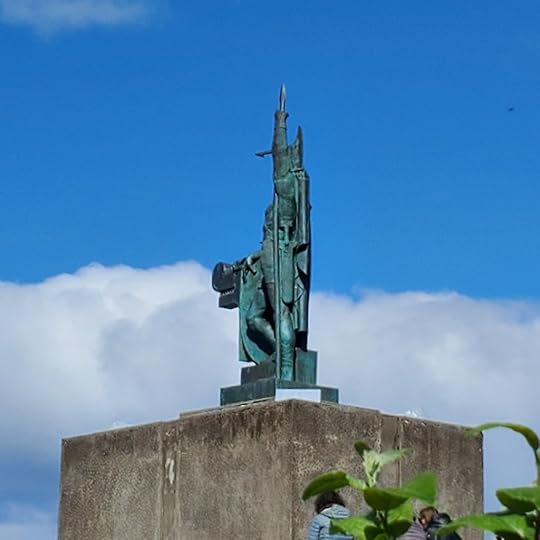 Although we visited Reykjavik briefly before we began our Arctic cruise, we returned to Iceland on August 16, 2024 for a better look. We took a bus tour that day and were introduced to the surrounding areas of Reykjavik. Some in our group preferred to strike out on their own to visit a geothermal swimming “hole”, the Blue Lagoon, nearby. We had signed up to visit another one like it on the other side of the island later. This day was a nice drive, during which our guide educated us about the long history of Iceland. The first Europeans to Iceland may have been the Romans, but they were probably Irish. The kayaks and other crafts of the Inuit wouldn’t have been able to travel to Iceland from Greenland or North America. Early records refer to a place called “Thule,” which must have been Iceland. There is evidence of a few Irish monks on the island before being driven off by the Norseman settlers who arrived in 874. The head Norseman was Ingolfr Arnarson. He likely brought British and Irish slaves with him. The statue above was erected in tribute to him in 1924.