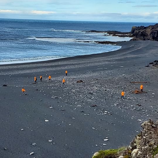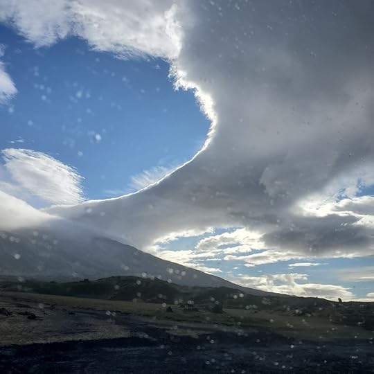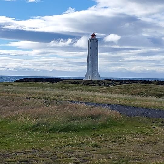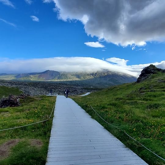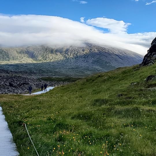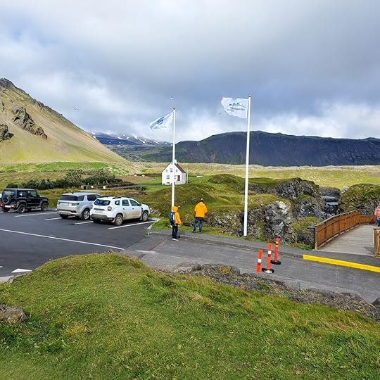 Our next day was a mostly sunny but cold, blustery day as we traveled to a large fjord at Grundarfjordur. Even bundled up in my wool hat and parka, the wind about knocked me off my feet. We walked up a paved incline overlooking the fjord edged by a black, volcanic rock beach. There was a narrow path that wound through rocky crags down to the beach, but I decided to save myself and walked to the overlook instead. I was fascinated with the large bird house near the parking lot. It was quite impressive. The constant wind on the island blew clouds into incredible shapes. Larry would fuss at me for not using the correct names of the cloud formations we saw. Like that shelf-shaped, rolling cloud above.