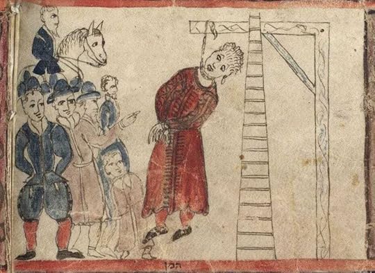 He felt the noose tighten round his neck. As he had suspected, it scratched and itched. The rope dangled from the nape of his neck, and he watched as it snaked upward, fifty cubits high, then back down again where four hulking soldiers were taking it in their hands.