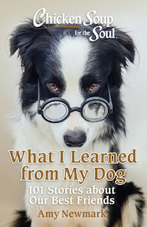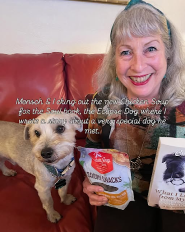 The book was recently published and is now available wherever books are sold. Although the story isn't about Mensch, he did have a supporting role, and that's why he's included in the photo above. The Chicken Soup for the Soul folks sent us a bag of their doggie treats that I sparingly fed to Mensch while he helped me open the box of books. Now, every time I open the door to the kitchen pantry he charges in ahead of me, sits and stares at the shelf with "his" treats, and thumps his tail as though saying, "Come on, Mom!"