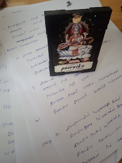 மூன்று நாட்களுக்கு முன்பு பக்கத்துஊர் பள்ளியிலிருந்து ஆண்டுவிழாவிற்கு வசனம் எழுதித்தரும்படி வெள்ளி கிழமை சாயுங்காலம் ஒரு தற்காலிக பள்ளிஆசிரியை வந்து கேட்டார். மிகவும் இளம் பெண். இந்த ஆண்டுதான் கல்வியியல் கல்லூரி முடித்ததாக சொன்னார். அன்று இருந்த என்னை பார்த்தது போல இருந்தது. இரண்டுநாட்களாக மேசைமீது அவள் கொடுத்த தாள்கள் இருந்தன. எழுத முடியுமா என்று சந்தேகம். பத்து பாடல்கள். காலையில் எழுந்ததும் கடகட வென்று மருந்து குடிப்பது போல எழுதி வைத்து விட்டேன்.
