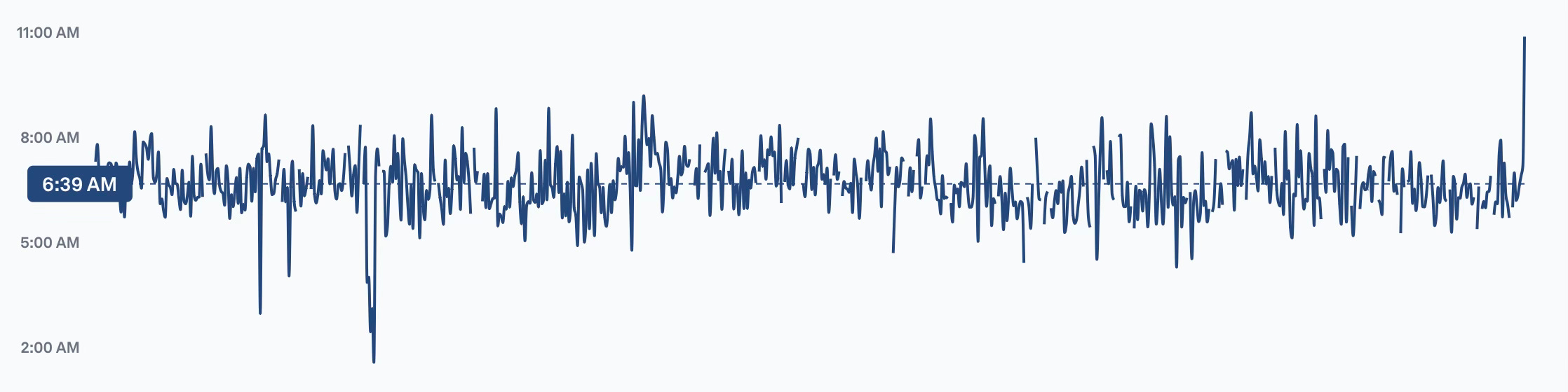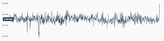 When I look at wake-up time however, the picture is both more promising and more confusing. I have an average wake-up time of 6:39 AM, with a variability of about an hour each week, although the variation is much greater than with bedtime (perhaps why the data looks better).
