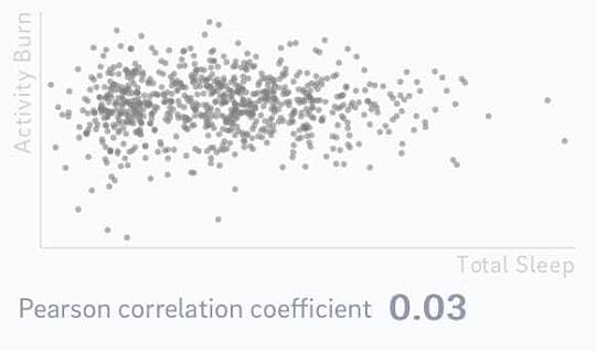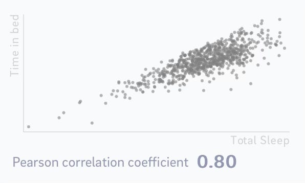 The correlation coefficient is much stronger, but again is not equal to one because sometimes when I have difficulty sleeping I spend a lot of time in bed awake.