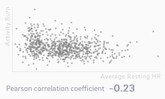 Control ExperimentsThe first control comparison I want to make is between Resting Heart Rate (RHR) and Heart Rate Variability (HRV). Resting heart rate is merely the lowest one’s heart rate gets during the day. This is a general marker of metabolic health and the strength of one’s heart, and tends to go down as one gets in better shape. HRV is the variation of time between each heart beat. A low HRV usually indicates persistent stress and is a sign of an overactive sympathetic nervous system and is indicative of poor fitness. Both metrics are influenced by fitness: RHR goes down with increased fitness, while HRV goes up, thus the two factors should be negatively correlated, which is indeed what we see.