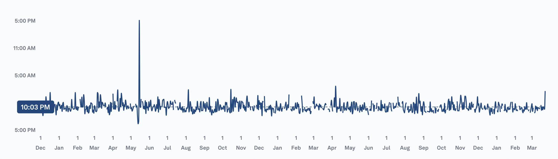 My average bedtime is 10:03 PM with variability between around 9pm and 11pm. I have extreme rare events between about 8pm and 2am.