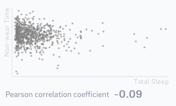 Finally, as a negative control I compared non-wear time (the amount of time I was not wearing the watch) to total sleep time. There is no correlation, as expected.