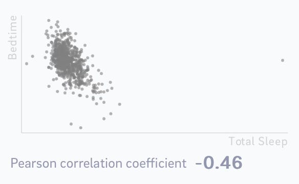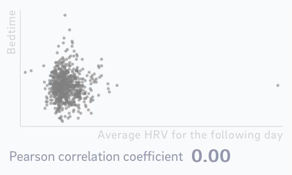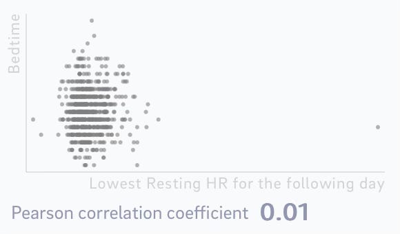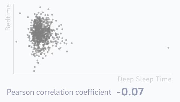 Importance of Bedtime and Wake-up timeThe first variable I want to test is the effect of bedtime on various markers of sleep quality. It’s been hypothesized that a consistent bedtime is important for high-quality sleep, and for health in general. If this is true, we should see a negative correlation between bedtime and total sleep, REM sleep, deep sleep, and HRV (for the next day, as a measure of recovery). We should also see a positive correlation between bedtime and resting heart rate (for the next day, as a measure of recovery).