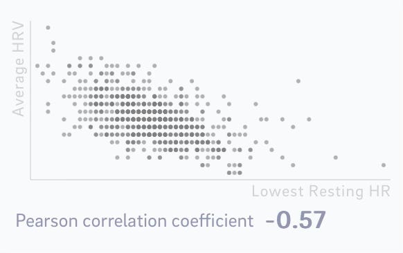 Although the correlation is not that strong (-0.57 is only a moderate negative correlation), it is still there. The reasons for a less than perfect correlation are multiple: HRV is often a faster responder to detraining or illness than RHR, meaning the correlation is offset in time, and HRV is much more sensitive to daily levels of stress than RHR is.