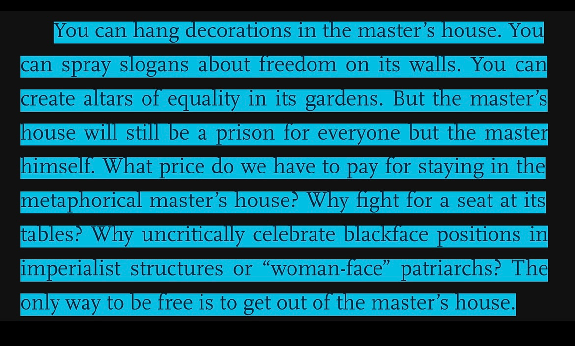 Catherine and the servants made me think of Audre Lorde who talked about how you cannot dismantle the master’s house using the master’s tools. Here is another expansion on that thought.