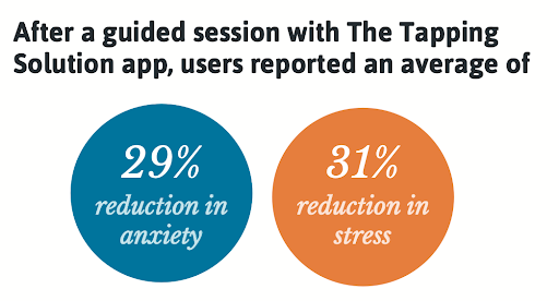 Significant reductions in stress and anxiety: After a guided session with The Tapping Solution app, users reported an average 29% reduction in anxiety and an average 31% reduction in stressApp-based Tapping works: No need for expensive sessions or waiting for appointments. You can take your wellbeing into your own hands with guided sessions via a free app (that’s available anytime and anywhere you need it)Immediate benefits: Users felt relief in real time, right away – showing just a few minutes of guided Tapping can provide major results