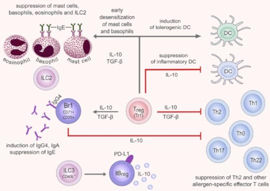 Но пока что самый популярный метод лечения аллергий – иммунотерапия. Та самая, которую используют японцы с ГМО-рисом. Иммунотерапия напоминает вакцинацию. Но когда мы вакцинируемся и получаем небольшое количество патогена или его частичек, мы ожидаем, что реакция организма на этот патоген, наоборот, в будущем усилится. Что будет мощный иммунный ответ. А вот при иммунотерапии ввод малой дозы аллергена, наоборот, уменьшает реакцию. Я нашел несколько схем, как это работает. Их можно описать двумя словами: все сложно. Суть примерно такова: антиген, то есть аллерген, в малом количестве активирует некоторые особые регуляторные Т-клетки, которые подавляют тучные клетки, а также пинают B-клетки, чтобы те произвели антитела, которые блокируют связывание антигена с иммуноглобулином E.