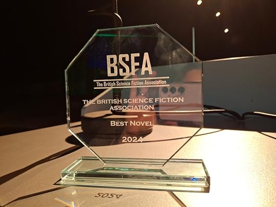 This weekend’s proof that the world is an incredibly strange place right now comes from Eastercon, the annual sci-fi convention held by the British Science Fiction Association. The BSFA awards were announced last night, and… Three Eight One got the most votes in the Best Novel category, so I’m amazed and completely beside myself and I won’t actually believe it until I have the award in my hands, but for now, here’s a long distance picture of said award: