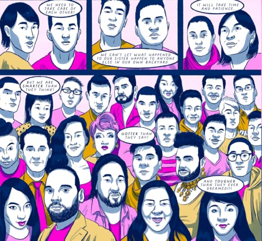 While much of this book is based in my own experience, I also interviewed many other people of varying ethnicities, gender identities, professions, economic backgrounds, and interests. Their stories and perspectives helped shape Gaysians in a profound way. I often had to write outside of my own experience, and I’m so grateful for their support in creating authentic characters. Many of the interviewees are illustrated in this scene of the book…